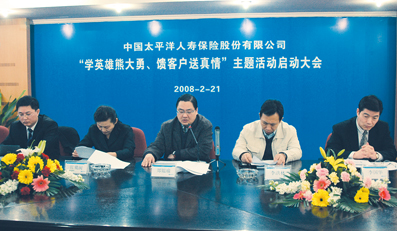 2008年2月21 日,太保壽險(xiǎn)召開“學(xué)英雄熊大勇,饋客戶送真情”主題活動(dòng)啟動(dòng)大會(huì),壽險(xiǎn)公司經(jīng)營委員會(huì)執(zhí)行委員、銷售總監(jiān)鄭韞瑜在會(huì)上作了動(dòng)員和布署,要求廣大營銷員和 客戶服務(wù)專員積極行動(dòng)起來,不僅要學(xué)習(xí)熊大勇同志忠于保險(xiǎn)事業(yè)、忠于人民、客戶至上的高尚品德,更要以他平日樂于奉獻(xiàn)、把客戶利益放在首位的先進(jìn)事跡為楷 模,將點(diǎn)點(diǎn)滴滴的感恩和關(guān)愛滲透在每一次為客戶服務(wù)的具體過程中,充分發(fā)揮業(yè)務(wù)一線人員的橋梁紐帶作用,以學(xué)英雄送關(guān)愛的具體行動(dòng)再一次向全社會(huì)展示太平 洋壽險(xiǎn)誠信天下、穩(wěn)健一生、追求卓越的品牌形象。