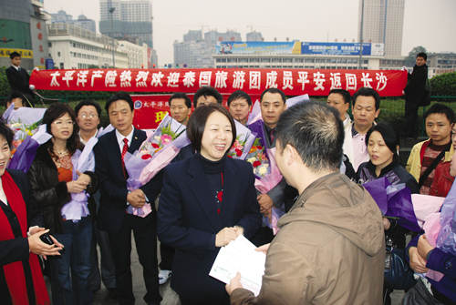 滯留泰國(guó)的游客送上鮮花,同時(shí),根據(jù)之前湖南新康輝國(guó)際旅行社與太保產(chǎn)險(xiǎn)湖南岳麓支公司簽訂的保險(xiǎn)團(tuán)購(gòu)合同旅行社責(zé)任險(xiǎn)條款,他們向每一位返鄉(xiāng)的游客送上