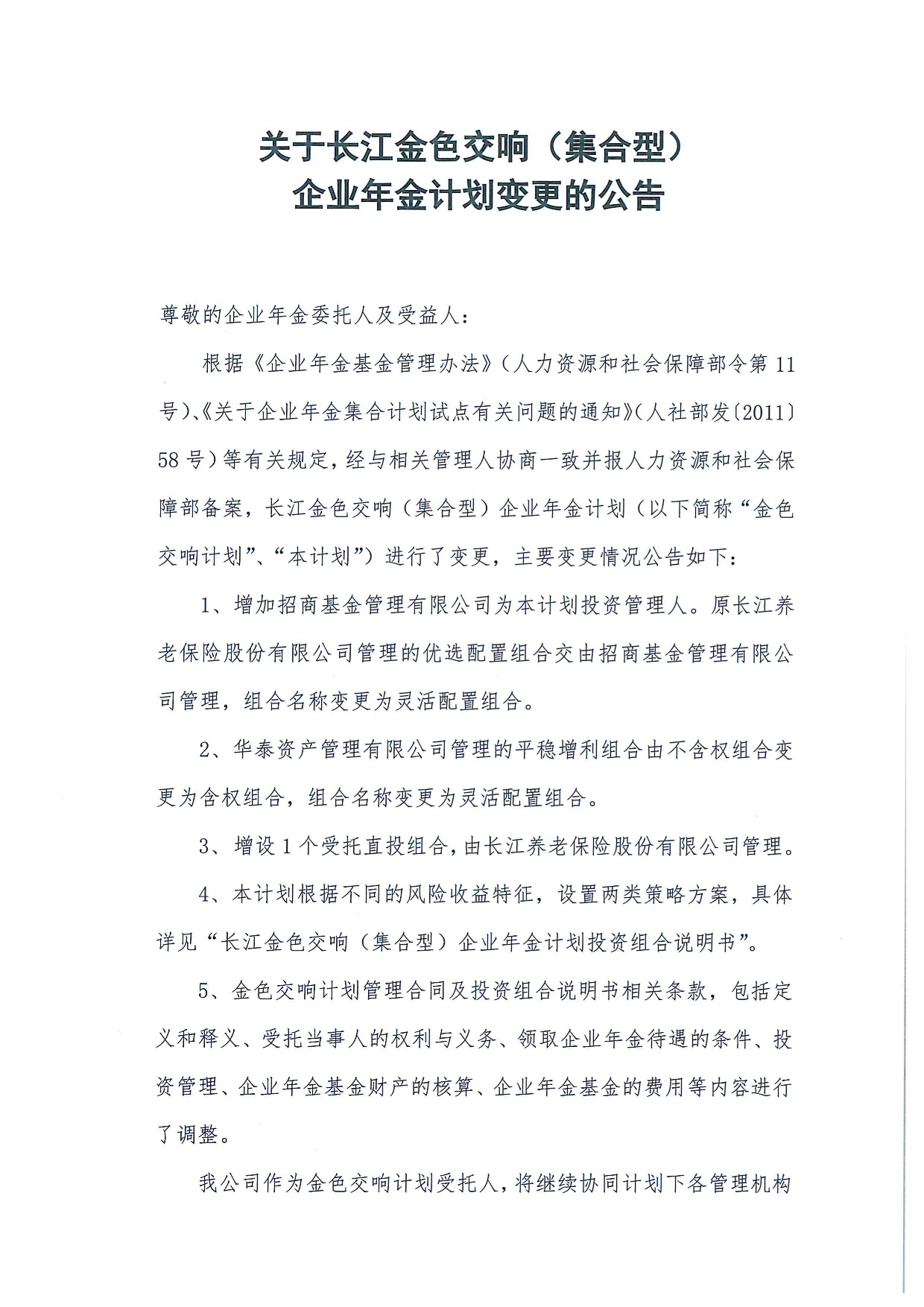 關(guān)于長江金色交響(集合型)企業(yè)年金計劃變更的公告(2021年12月)