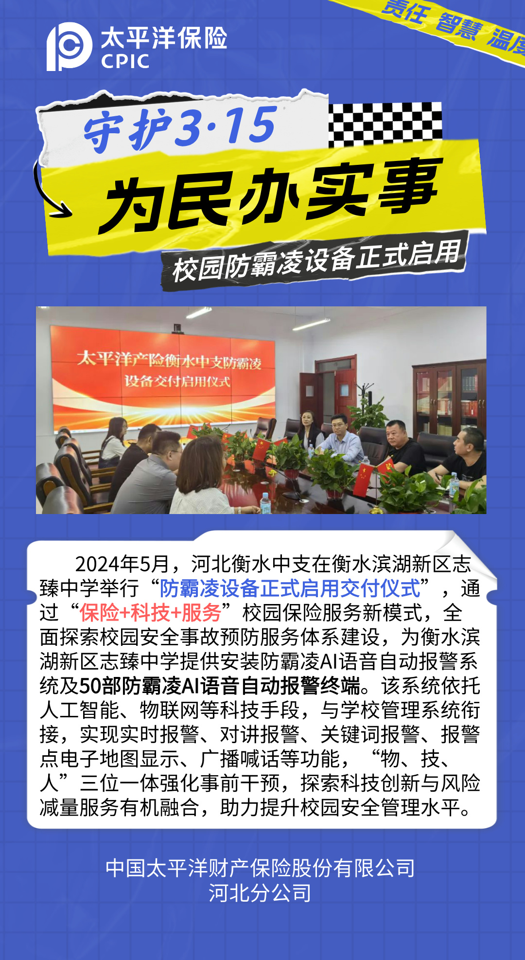 中國太保產(chǎn)險河北分公司為民辦實事之校園防霸陵設(shè)備正式啟用