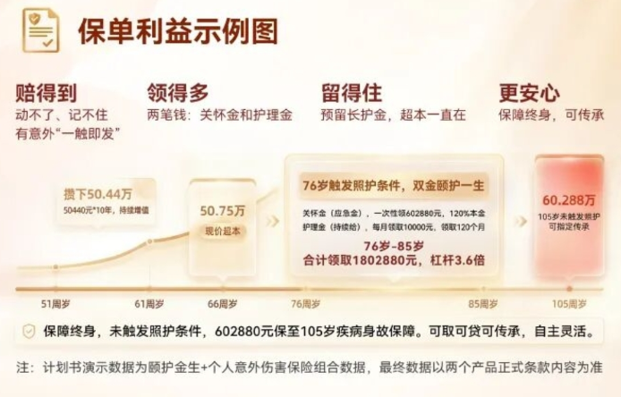 保障終身,61周歲后(含),未觸發(fā)照護(hù)條件,602880元保至105歲疾病身故保障。
