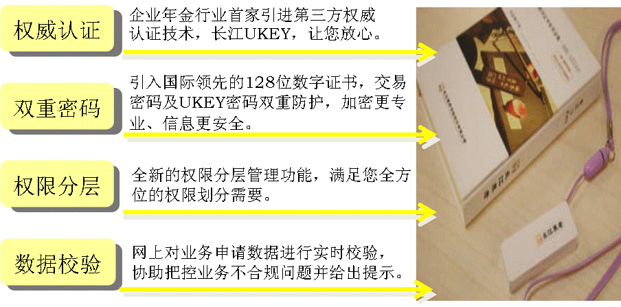 長江養(yǎng)老在信息安全和業(yè)務(wù)風險防控技術(shù)方面位于行業(yè)前列,不僅率先在業(yè)內(nèi)引進第三方權(quán)威數(shù)字認證技術(shù),還根據(jù)養(yǎng)老金業(yè)務(wù)特點,開發(fā)設(shè)置了網(wǎng)上交易密碼、經(jīng)辦人權(quán)限分層管理、業(yè)務(wù)數(shù)據(jù)實時校驗等風險防控措施。一系列技術(shù)手段結(jié)合成的隱形安全屏障,能有效防止企業(yè)年金信息外泄,極大提高業(yè)務(wù)辦理的安全性,令企業(yè)樂享安心無虞的年金服務(wù)。